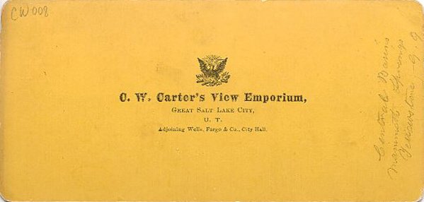 Charles William Carter was born in London, England on August 4, 1832. Early in his life in England he was a schoolmaster, and was also a sergeant in the British army. Carter came to Salt Lake City in 1859, and set up his first photograph studio. As one of Utah's most famous early photographers, Carter documented the construction of the Mormon Temple and Tabernacle. He also made fine views of Shoshone Indians, mining, the Transcontinental Railroad construction and Mormon life. He died at the home of his daughter, Mrs. George Smith, in Midvale, Utah on January 27, 1918.