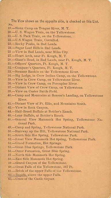 In 1879, after his stay at Ft. Keogh, Fouch produced views from his Minnesota home at Lake Minnetonka. Here he reissued his Yellowstone series under the title "Artistic Views of the Yellowstone Country and Yellowstone National Park, Series of 1876, 1877, and 1878." Most of these photos were of the Montana Territory, but a few were in the park. Some, if not all, of his Yellowstone photos date from the summer of 1878.