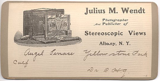The only Yellowstone views known are all credited to Julius Wendt (not Wendt Brothers). Notice the word "Calf" that proceeds each title. It seems that Wendt was using photographs taken by H. B. Calfee, and this was his way of crediting Calfee.