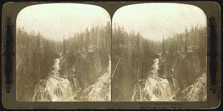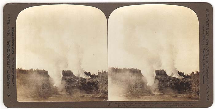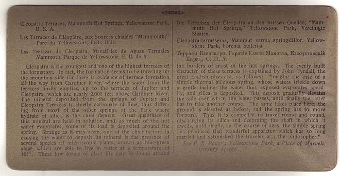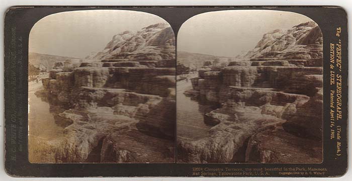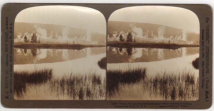 He didn't get into producing stereoviews until much later, 1899, but applied the some quality control and innovative technology to making them as he had to the viewers. He designed an automated assembly line which moved the photo paper in front of the negative, exposed it, and moved it on to standardized developing, fixing, and washing. Cutting and mounting of the prints was also done by machine. As a result the views which White produced are consistently the highest quality of any ever made, far better than those of his contemporaries Underwood and Keystone. In 1907 he built a large factory incorporating this assembly line which was the finest in the world, with a production capacity of about 15,000 views per day. He also pioneered the use of a lengthy, informative text on the back of the view. About the only flaw in his design was that he used a very dark gray card stock and gilt or black lettering, a combination which is often extremely hard to read.