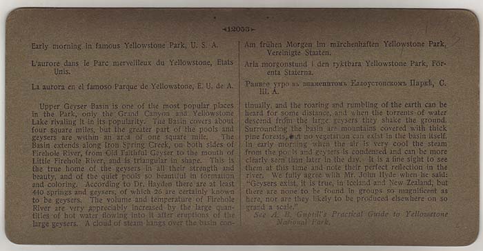 This is the more common type of H. C. White Yellowstone view. The set was offered in a 100 view boxed-set as well as a 30 view subset. (The views were offered individually as well) The set numbers range from #12001 through #12100 for the boxed-set. What is interesting is that there are actually at least 9 more views. Numbers #12101-12109 have now been identified. These were not part of either boxed set, although they were a part of the overall 12,000 series.