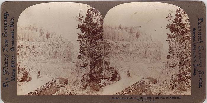 For Yellowstone collectors, two printing styles exist of Whiting’s, black & white 1300 series. One on regular sized, gray mounts, and the other on tan mounts. The numbering appears continuous from #1300 to at least #1322 although not all views have surfaced and been recorded.